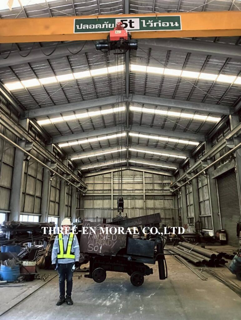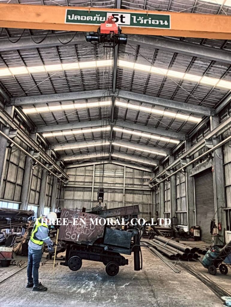 ทีมวิศวกรได้เข้าไปตรวจสอบและทดสอบเครนเหนือศรีษะ หรือโอเวอร์เฮดเครน (Overhead Crane) โรงงานลูกค้า ตรวจเช็คระบบการใช้งานต่างๆของปั้นจั่น รอก เครน ตรวจวัดขนาดโซ่ ดูการชำรุดสึกหรอ สัญญาณเสียงและแสงไฟเตือน ความสว่างของไฟ และระบบเสียงเตือนได้ยินชัดเจน พร้อมทดสอบพิกัดการยก (Load test) โดยการใช้น้ำหนักจริงเพื่อทดสอบการยกอย่างปลอดภัย